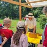 Nach so viel Wissensvermittlung bildete der Drohnenflugwettbewerb den unterhaltsamen und fast unglaublichen Abschluss. Fast unvorstellbar: Hannes Beims von der Fachberatung für Imkerei stellte sein Fingerspitzengefühl unter Beweis, gefolgt von echten Adleraugen. Mit einer Pinzette befestigte er am Rücken von rund 30 Drohnen Nummernplättchen. Wie im echten Sport auch, waren die männlichen Bienen mit Rückennummern unterwegs. Zunächst versammelten sie sich in einer Holzkiste. Danach eröffnete Hannes Beims ein kleines Wettbüro: „Sie dürfen wetten! Wir lassen diese Drohnen einige hundert Meter weiter am Eingang des Museums frei. Dann schauen wir, welche Drohnen am schnellsten wieder da sind!“ Es wurde fleißig gewettet unter den Besucherinnen und Besuchern. Wer würde den Flug gewinnen? Drohne Nummer 66, 70 oder 90? Marinus Gassner begab sich mit den Drohnen zum Eingang des Museums und ließ sie frei. Danach hieß es Warten auf die Rückkehrer. Hannes Beims war zunächst zuversichtlich. „Normalerweise dauert es 30 Sekunden oder eine Minute, bis sie wieder da sind.“ Unterstützt von einigen Besuchern, kontrollierte er das Einflugloch am Bienenstand. Doch die Drohnen hatten zunächst andere Pläne. Sie ließen auf sich warten. Die Gäste vermuteten, dass sie in der Museumsgaststätte eingekehrt waren, wo es so gut nach Kuchen duftete. Es dauerte gut eine Stunde, bis die Sieger eintrudelten. Da hatten die meisten Teilnehmer der Wette die Geduld verloren und waren im Museum unterwegs oder hatten es sich im Biergarten gemütlich gemacht. Hannes Beims gab die Hoffnung nicht auf, und seine Geduld wurde belohnt: Platz 1 erlangte die Drohne mit der Rückennummer 75, gefolgt von den Drohnen Nummer 38 und Nummer 97. Der Sieger und die Drittplatzierte konnten zum Glück noch gefunden werden. Die Zweitplatzierte mit der Nummer 38 darf sich gerne noch beim Museum melden und ihren Preis abholen. Als ersten Preis gab es Freikarten für das Museum und ein Glas Honig, für die Plätze zwei und drei jeweils auch ein Glas Honig!