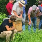 - jpg: Der Mitarbeiter der Fachberatung für Imkerei des Bezirks Oberbayern, Marinus Gassner, mit Besuchenden an neuem Schaubienenkasten des Museums © Rosi Raab