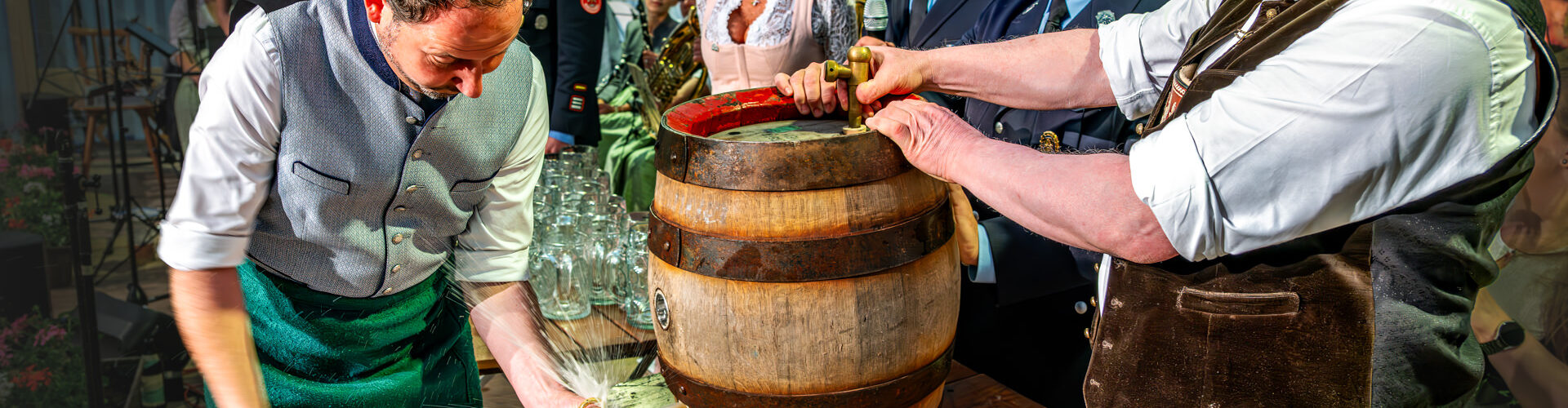 Mit drei kräftigen Schlägen: Bieranstich eröffnet Jubiläumswoche der Freiwilligen Feuerwehr Riedering