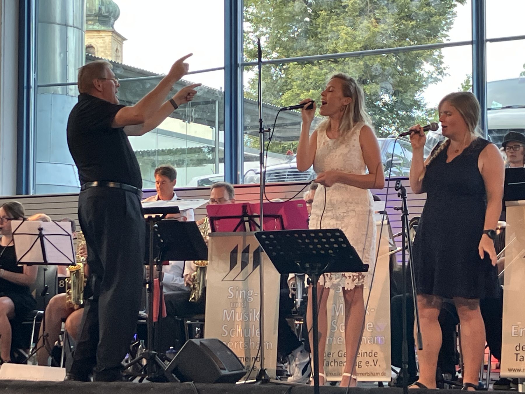 Begeisterten mehr als zwei Stunden lang: die Big Band Emertsham unter der Leitung von Leopold Gnedel und die Sängerinnen Lisa Fischbacher (links) und Regina Huber.