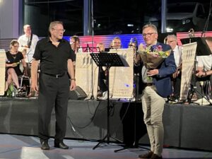 Dank an den Leiter der Big Band, Leopold Gnedel, in Form von Blumen, überreicht von Bürgermeister Andreas Bratzdrum (rechts).
