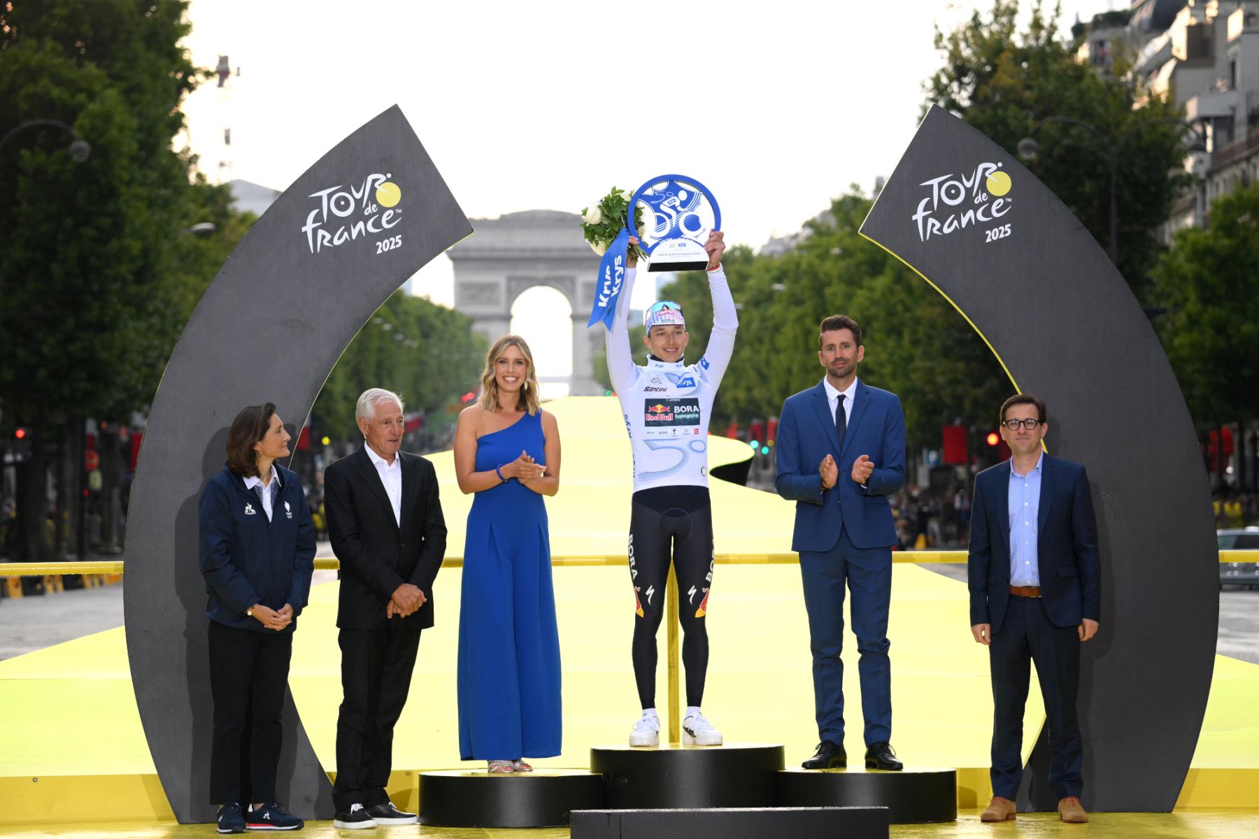 Florian Lipowitz wird Dritter der Tour de France 2025 und gewinnt das Weiße Trikot des besten Nachwuchsfahrers. (Foto by Bernard Papon – Pool/Getty Images)
