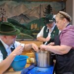 Die anwesenden Kursteilnehmer, konnten nicht nur zuschauen, sondern auch selbst mit Hand anlegen, wie z.B. die verschiedensten Strudelteige herstellen, Brotteig ansetzen, oder Brote in den vorgeheizten Steinbackofen einschießen usw. Die Teilnehmerinnen und Teilnehmer hatten sichtlich Freude daran, traditionelle Backtechniken auszuprobieren. Der köstliche Duft frisch gebackener Spezialitäten erfüllte die Edelweiß-Scheuer und lud anschließend zum Verkosten ein. Begleitet wurde die Veranstaltung von der Ziachmusi der beiden Musikwarte des Rhein-Main-Gauverbandes, Michi und Jürgen, mit Posaunenbegleitung von Steffen Feldmann vom Trachtenverein Mainz-Weisenau. Bei der Verkostung der herzhaften Schmankerln blieb anschließend noch Zeit für Gespräche und Austausch der Teilnehmer und Gäste untereinander.