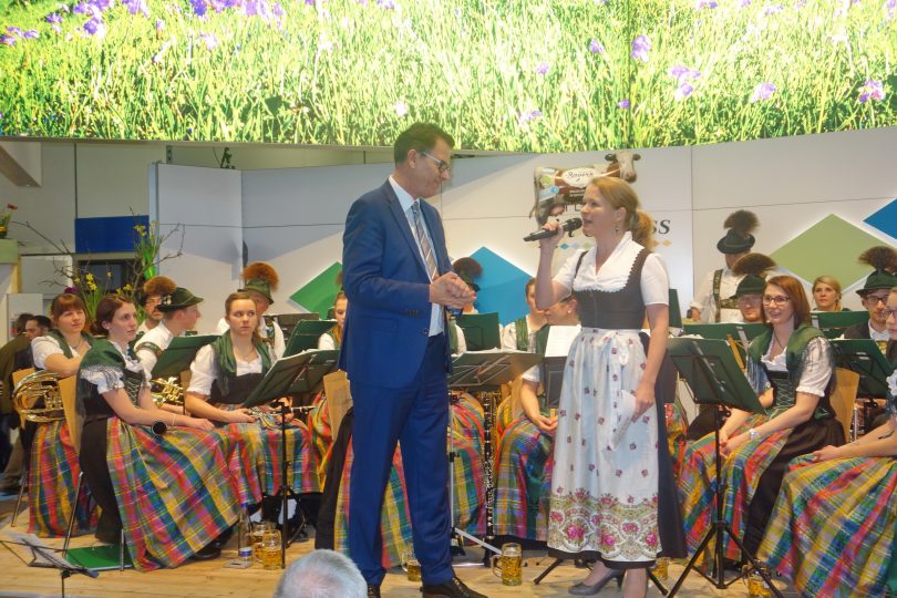 Foto: Hötzelsperger – Entwicklungsminister Gerd Müller in der Bayernhalle mit Moderatorin Regina Wallner