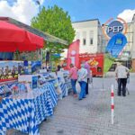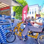 „So etwas haben ich und mein mich immer begleitender Musiker Georg Dumberger (Musiker-Schorsch aus Eggstätt) bislang noch nicht gesehen: Am Tourismusstand vor dem PEP in Torgau tauchte das Ehepaar Karin und Jürgen Benndorf mit einem äußerst ungewöhnlichen Gefährt auf, um sich über Urlaubsmöglichkeiten in der Region Chiemsee-Alpenland zu informieren“. Wie Bude weiter informierte, handelt es sich bei dem holländischen Radl um ein sog. “Fun’ 2 go”, ein Fahrrad für zwei Personen nebeneinander, das durch einen Akku unterstützt wird. „Herr Benndorf hat es sich angeschafft, weil seine Frau wegen Knieproblemen schlecht laufen kann, das ist durchaus ein Tipp für Behinderte, denen es vielleicht ähnlich geht“ – so der vormalige Aschauer Tourismus-Chef, der als „Alter Hase“ wieder was dazulernen konnte. Natürlich beteiligte sich das Ehepaar am traditionellen Gewinnspiel des Urlaubs-Trucks und mit ganz besonderem Interesse nahmen sie sich die Broschüre „Barriefrei“ vom Tourismusverband Chiemsee-Alpenland mit.