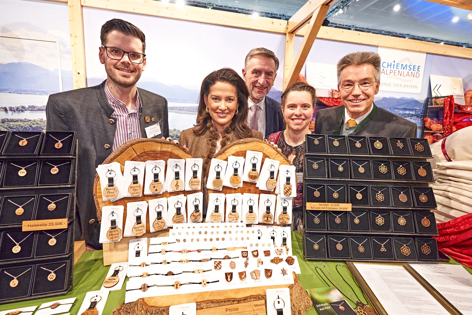 Staatsministerin Michaela Kaniber beim Stand Trachtentaschen Brandstetter gemeinsam mit (v.l.n.r.) BBV-Präsident Günther Felßner, Susanne und Michael Brandstetter.