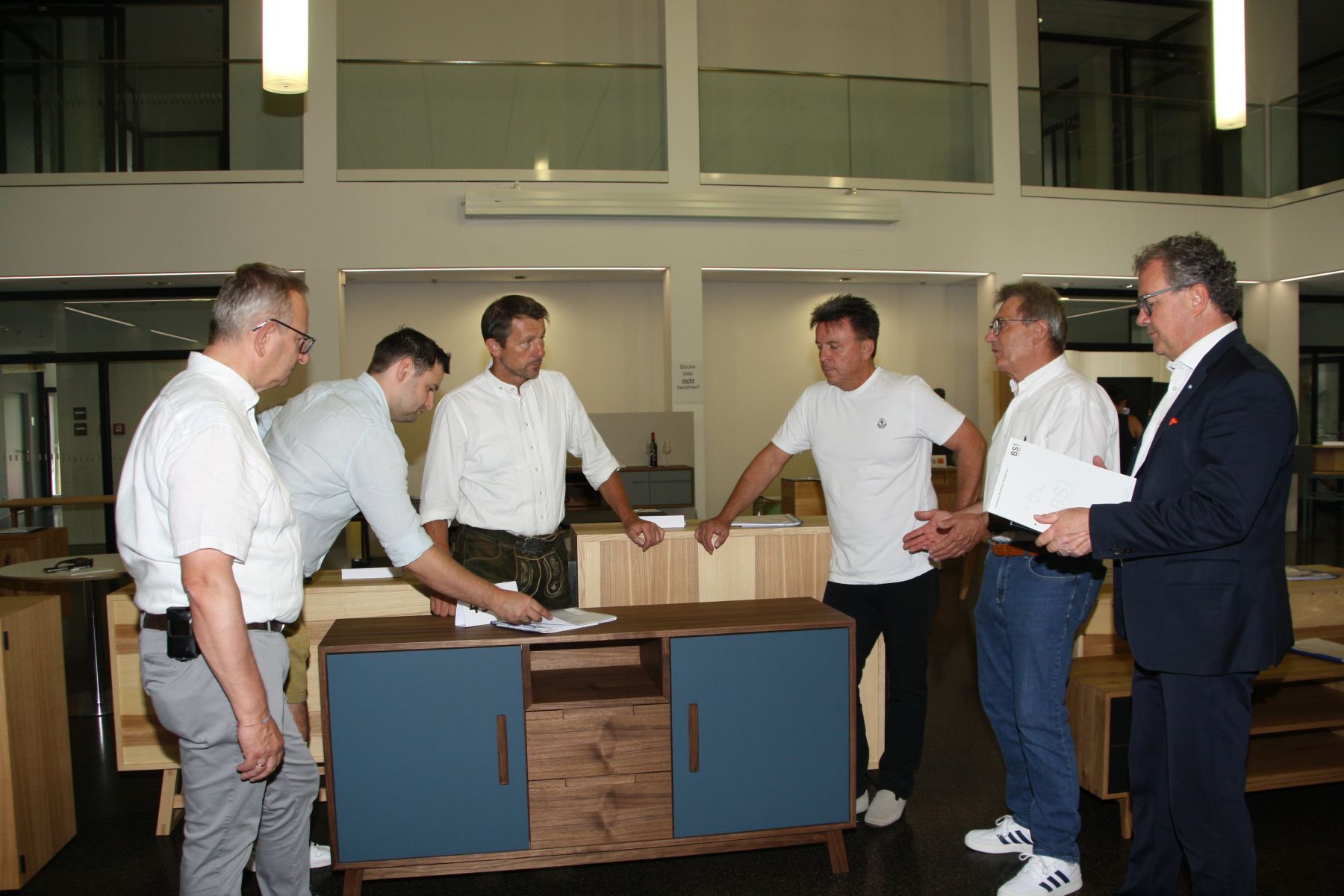 Die Jury-Mitglieder bei der Arbeit: Hier bei der Bewertung eines Sideboards. Von links: Stadtbrandrat und Amtsleiter für Brand- und Katastrophenschutz, Hans Meyrl, Schreinermeister Peter Hanslmaier aus Pfaffing, Kreishandwerks- und Zimmerermeister Rudi Schiller aus Soyen, der Schulleiter des BSZ, Stefan Schellenberger, Obermeister der Schreiner-Innung im Landkreis Rosenheim, Peter Moser, und Hochschulratsvorsitzender und Landtagsabgeordneter a.D. Klaus Stöttner.