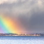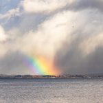 Dann schoben sich dunkle Wolken vor die Sonne, aus denen am Nordufer ein kräftiger Regenschauer niederging. Durch eine Wolkenlücke brach ein kräftiger Sonnenstrahl und erzeugte über Seebruck einen mystischen Regenbogen. Ein kräftiger Nordwind vertrieb mich dann vom Turm.