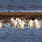 Im flachen Wasser hatten sich aber über 30 Silberreiher zum Schlafen versammelt. Ein vorbeifliegender Höckerschwan störte kurz und einige Köpfe wurden sichtbar. Als feststand, dass keine Gefahr drohte, verschwanden die Köpfe der Reiher wieder unter ihren Flügeln. Die kopflos scheinenden Reiher ruhten noch eine halbe Stunde, bis sie von der Morgensonne gewärmt zu ihren Tagesziel aufbrachen. Mehrere Stockentenerpel landeten vor dem Beobachtungsturm und warben eifrig schnatternd um die Enten. Zwei Erpel kämpften ausdauernd um das allerdings teilnahmslos wirkende Weibchen.