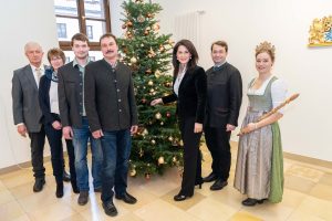 Baum vor dem Ministerbüro (v. l.): Thomas Emslander (Vorsitzender des Verbands Bayerischer Christbaumanbauer), Familie von Claus Meier vom Christbaumstadl Indersdorf, Ministerin Kaniber, Josef Ziegler (Präsident des Bayerischen Waldbesitzerverbands) und Waldkönigin Johanna Gierl.