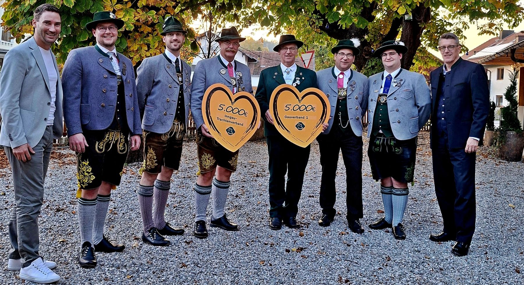 (v.l. Markus Eichenseer (geschäftsführender Vorstand des VR Gewinnsparvereins Bayern eV), Rupert Mehringer (Gaujugendvertreter), Hans Gschwendtner (Gaukassier), Pankraz Perfler (1. Gauvorstand Inngau-Trachtenverband), Alfred Gehmacher (stellv. Gauvorstand Gauverband 1), Peter Feldschmiedt (Gaukassier), Martin Luger (Gaujugendvertreter), Bernhard Failer (Vorstandsmitglied der Raiffeisen-Volksbank Ebersberg eG)