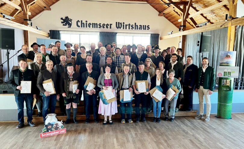 Seit vier Jahren zeichnet die Molkerei Berchtesgadener Land jährlich die Betriebe mit der besten Milchqualität unter ihren rund 1.600 Mitgliedern aus. Die Auszeichnung geht dabei an jene 50 Betriebe, die im gesamten Vorjahr durchgehend alle strengen Qualitätskriterien erfüllt und darüber hinaus überdurchschnittliche Werte erzielt haben. Im festlichen Rahmen eines 3-Gänge-Menüs im Chiemgau-Wirtshaus in Chieming wurden die Ehrenurkunden und -plaketten 2024 überreicht. Vorstandsvorsitzender Andreas Argstatter begrüßte dazu die Landwirt:innen persönlich und dankte für ihr tägliches Engagement: „Milch ist unser wichtigster Rohstoff – die Qualität, die Sie liefern, ist die Grundlage für unseren gemeinsamen Erfolg.“ Geschäftsführer Bernhard Pointner betonte bei der feierlichen Veranstaltung: „Was wir heute ehren, ist nicht eine Goldmedaille im Sprint, sondern Gold im Ultramarathon, denn wer das ganze Jahr über – und einige von euch über Jahre hinweg – seine Qualität derart im Griff hat, der spielt in der ersten Liga.“