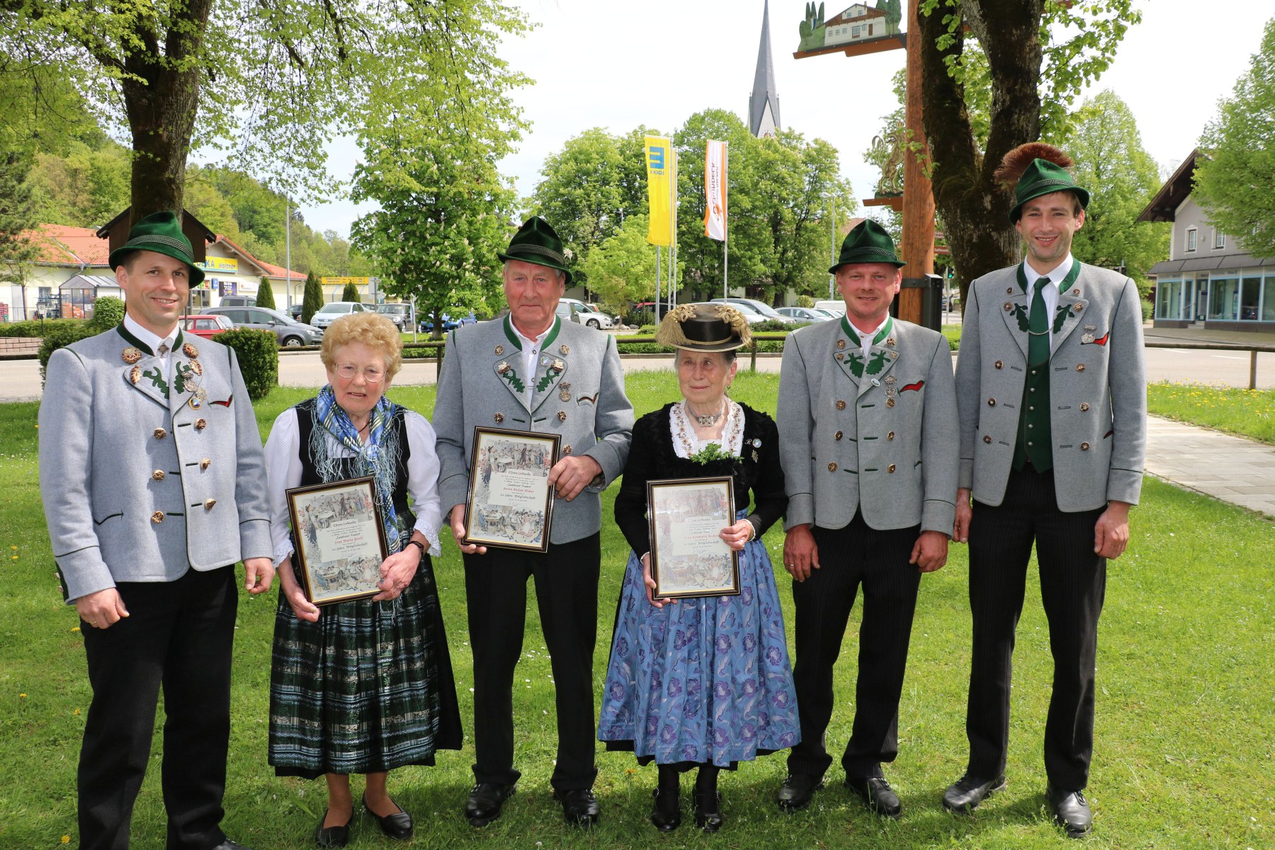 Der Vorsitzende des Trachtenvereins „D´ Lamstoana“ Frasdorf Sepp Enzinger (links) und seine beiden Stellvertreter August Stettner junior und Georg Wörndl überreichten die Ehrenurkunde für 60 Jahre aktive Vereinsmitarbeit an Maria Pertl, Stefan Weber und Rosmarie Aicher.