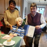 -Mit einem Geschenk dankten Uschi Gnadl und Robert Leitner der 102jährigen Gertraud Waschin für 50 Jahre Treue zum VdK-Ortsverband Übersee.