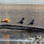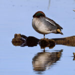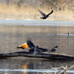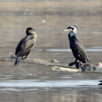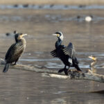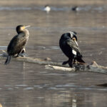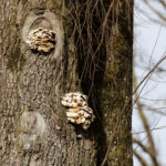 - Zuerst wird die Prienmündung aufgesucht. Auf einem im Wasser liegenden Baumstamm hat sich eine einzige Brandgans eingefunden. Das herumgefliege der Rabenkrähen bringt sie nicht aus der Ruhe. Auch die beiden Kormorane sind davon unbeeindruckt und wärmen und putzen sich. Schön anzusehen sind immer wieder die kleinen Krickenten beim Mittagsschlaf. Ein Weibchen hat noch Hunger. Bei den Kormoranen zeigt sich das Männchen im Prachtkleid von seiner attraktiven Seite: Scheitel und Nacken und im Bereich der Flanken mit weißem Gefieder. Die ersten Frühlingsboten sind da. Der Gesang der Stare ist besonders schön. Noch sind sie scheu und sitzen hoch oben auf den Bäumen. An einem Baumstamm wachsen vermutlich Schwefelporlinge (Gattung Laetiporus).