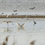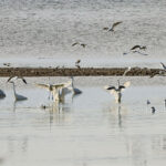 - Weiter geht es zum Aussichtsturm in Seebruck. Von hier sind die Rufe der Großen Brachvögel gut zu hören, aber sie halten sich leider sehr entfernt auf. Dann kann ein Schauspiel betrachtet werden. Zuerst stehen acht Silbereiher nahe beieinander und warten auf vorbeischwimmende Fische. Plötzlich gibt es lautes Möwengeschrei und ein größerer Trupp Lachmöwen scheint beim Fischen erfolgreich. Das wollen sich die Silberreiher nicht entgehen lassen und fliegen zu der Stelle, wo die Lachmöwen aktiv sind. Es wird ziemlich hektisch.