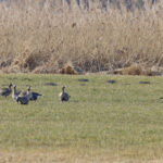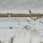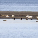 - Nun geht es zur letzten Station, dem Lachsgang. Hier hält sich ein größerer Trupp Blässgänse auf. Auf großer Distanz lassen sich die aufmerksamen Gänse fotografieren. Daneben sind sehr viele Graugänse auf den Wiesen. Auf der Landzunge ist Betrieb. Viele Mittelmeermöwen, einige Kormorane und Graugänse ruhen dort. Die Blässgänse sind auch dort eingetroffen. Mehrere Singschwäne halten ihren Verdauungsschlaf. Hier fühlen sie sich sicher. Zurück bei den Wiesen. Ein großer Trupp Graugänse umrundet fliegend mehrmals die Wiesen und landet dann auf einer, wo bereits eine Gruppe Graugänse sich aufhält.