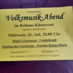 Ein Volksmusik-Abend wird am Mittwoch, den 26. Juli, um 20 Uhr im Rathaus-Klostersaal in Fischbachau veranstaltet. Es spielen die Musikgruppen Röpfl Geigenmusi, Früahdirndl und Hopfgassler Soatnmusi sowie Martina Holzer an der Harfe. Als Sprecher fungiert Josef Furtner.