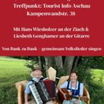 Nach dem erfolgreichen Auftakt im Frühjahr findet am kommenden Sonntag, 17. August, erneut das musikalische Bankerlsingen in Aschau statt. Hans Wiesholzer an der Ziach und Liesbeth Genghammer an der Gitarre stimmen wieder Lieder zum Mitsingen an. Gemeinsam mit allen singfreudigen Teilnehmerinnen und Teilnehmern werden alpenländische Weisen gesungen – begleitet von Ziach- und Gitarrenklängen.