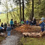 Wie gut die Kinder schon gelernt haben, zeigten sie in ihrem „Morgenkreis-Ritual“. Dazu sitzen sie alle im abgesteckten Spielplatz und singen ihr „Waldlied“ mit viel Körpereinsatz, die „Instrumente“ sind die gefundenen Äste aus Holz – und dass sie daran viel Spaß haben, kann man aus ihren fröhlichen Gesichtern ablesen.