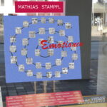 Fotos: Helga Stampfl – Projekt „Emotionen“ von Mathias Stampfl am Schaufenster von Optik Schmetterer-Stein in der Bernauer Straße in Prien a. Chiemsee – u.a. Mathias Stampfl vor seinem Werk und Mathias Stampfl mit Petra Stein und mit seiner Mutter Helga.