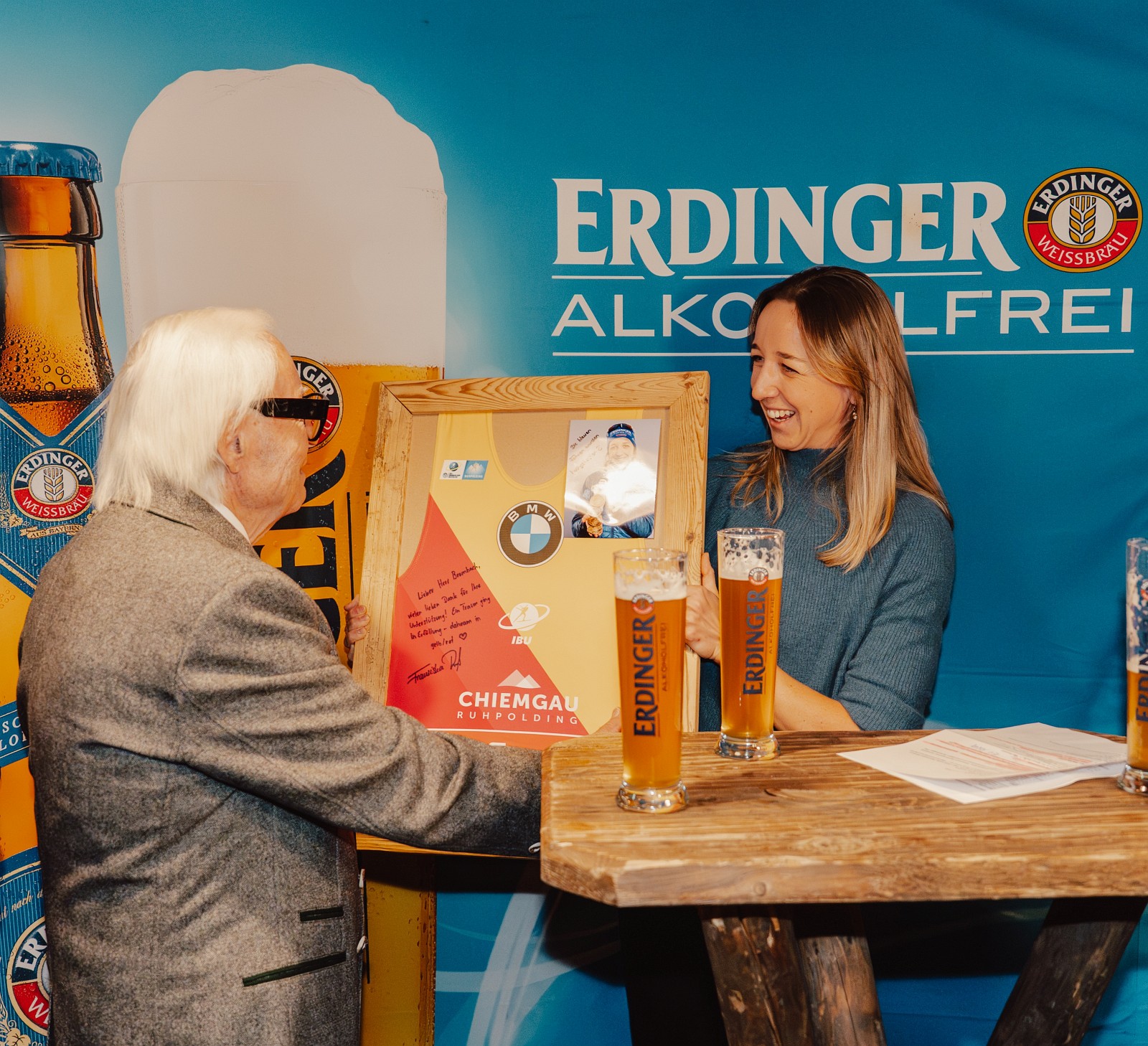 Franziska Preuß bedankte sich bei Werner Brombach mit einem besonderen Geschenk für die langjährige Unterstützung: ein Original-Weltcup-Trikot in Gelb (Führung im Gesamtweltcup) und Rot (Führung in der Massenstartwertung) mit persönlicher Widmung.