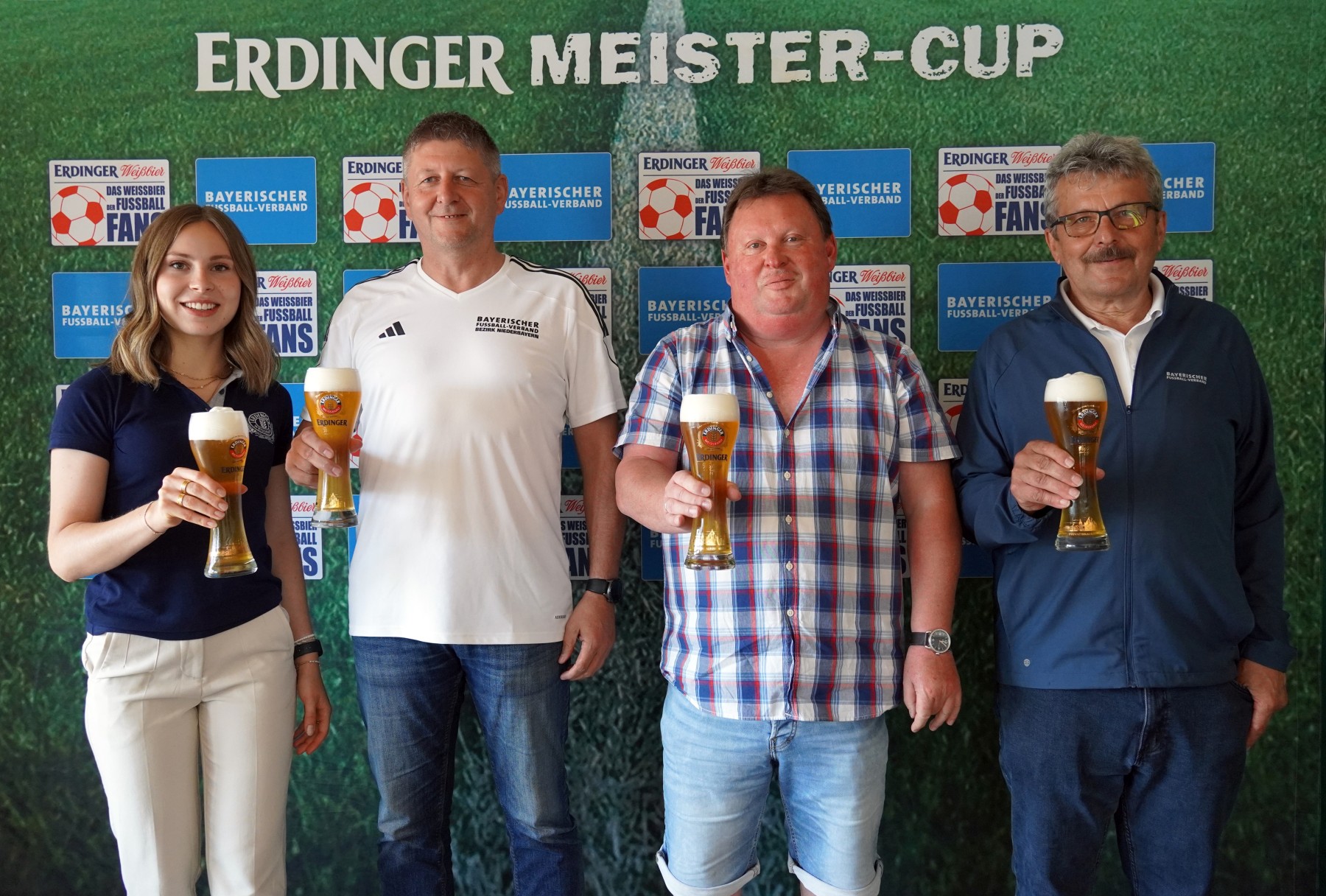 (v. l. n. r.): Theresa Strohhofer (ERDINGER Weißbräu), Robert Fischer (Bezirks-Schiedsrichterobmann), Andreas Schäfer (Gesamtkoordinator Fußball SpVgg Grün-Weiß Deggendorf), Josef Janker (Verbandsspielleiter BFV)