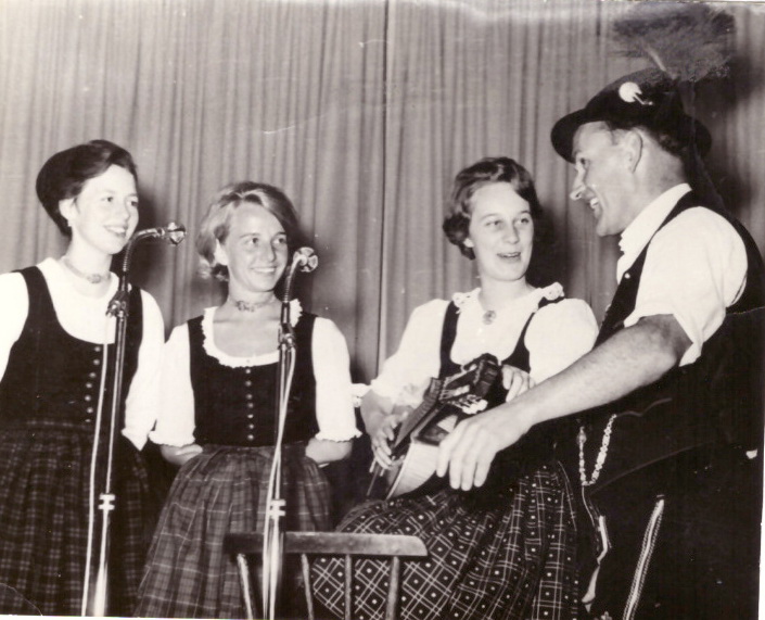 Fotos/Repros: Hötzelsperger –  Heimatabend in Prien am 15. Juni 1967 im Bayerischen Hof: Ernst Rupp zusammen mit Marianne Eham aus Wies bei Piezenau/Irschenberg sowie mit Ilse Gossner und Gisela Obermaier, beide aus Aschau i. Chiemgau, als der Aschauer Dreigesang.