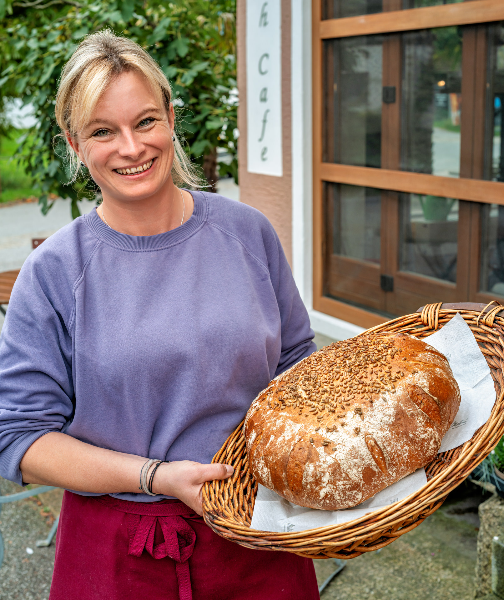Frisches Brot als Symbol des Lebens: Mit einem Lächeln präsentiert Monika Schnell von der Bäckerei in Lauterbach das selbst gebackene Brot für den Erntedankaltar.