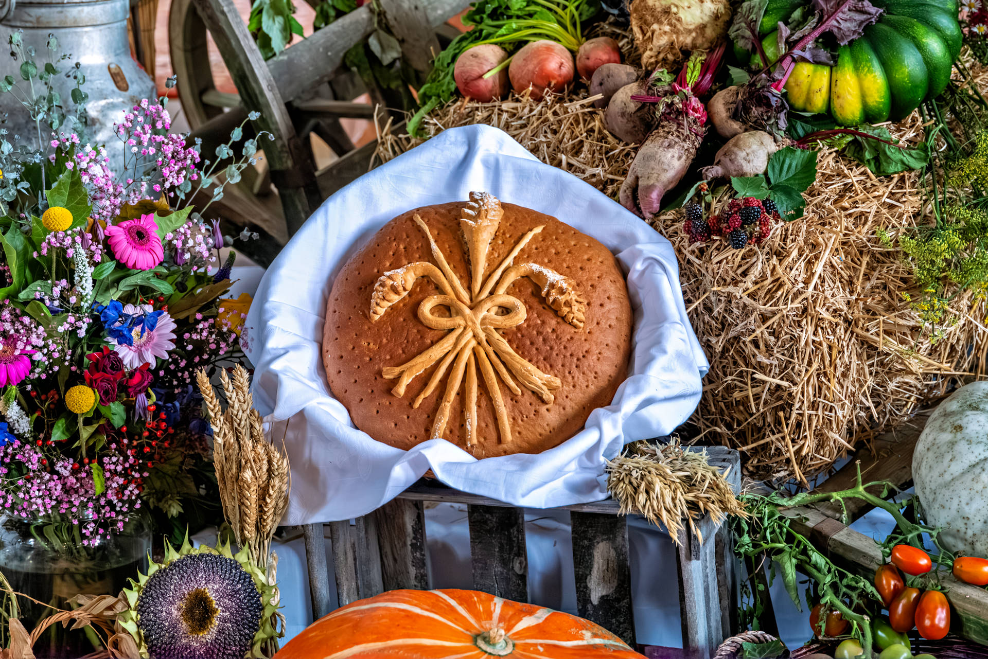 Kirche in Aschau: Kunstvoll verziertes Brot: Ein Laib mit Ährenmotiv erinnert daran, dass das tägliche Brot nicht selbstverständlich ist.