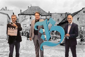 v.l.n.r.: Staatsminister für Wissenschaft und Kunst, Bernd Sibler, Direktor Dr. Richard Loibl (HdBG) und Dr. Egon Leo Westphal, Mitglied des Vorstands der Bayernwerk AG vor der historischen Stadtkulisse Regensburgs. Das Hintergrundbild wurde 1953 am Donaumarkt aufgenommen, heute befindet sich an genau dieser Stelle der Museumsladen © Haus der Bayerischen Geschichte | Foto: www.altrofoto.de und © Stadt Regensburg, Bilddokumentation