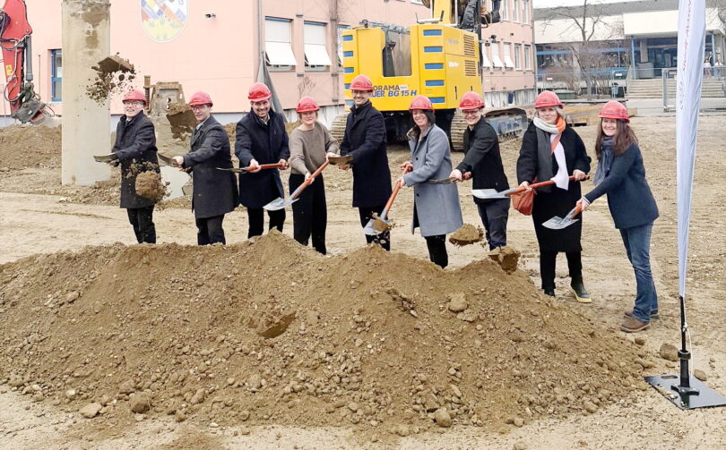 Mit einem symbolischen Spatenstich hat die umfangreiche Erweiterung der Grundschule Pang und die Aufstockung des benachbarten Kinderhauses begonnen. Ziel dieser Baumaßnahmen ist die Schaffung von Klassenräumen für vier weitere Grundschulklassen sowie Aufenthalts- und Mittagessensräume für die offene Ganztagsschule. Zudem entstehen durch den Umbau Betreuungsplätze für statt bisher 50, künftig insgesamt 125 Kinder in drei Kindergarten- und zwei Hortgruppen.
