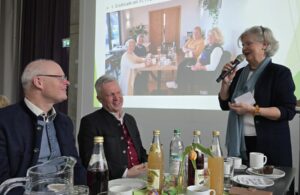 Moderatorin Sigrid Knothe mit Pfarrer Guido Seidenberger (links) und Bürgermeister Rudolf Leitmannstetter