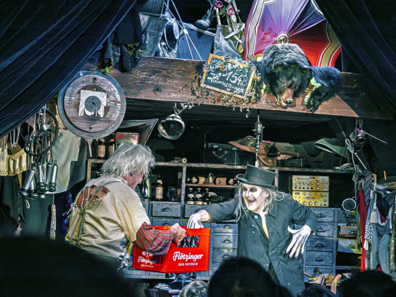 Himmegugga trifft Boandlkramer beim Flötzinger-Familienfest – 1543. Aufführung im Riederinger Theaterzelt.