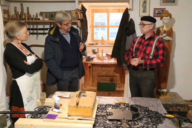 Kunst im Oberen Priental: Gemeinderat Wolf Neelsen (Mitte) in der Künstlerwerkstätte Huba bei Christian und Alraune Huba