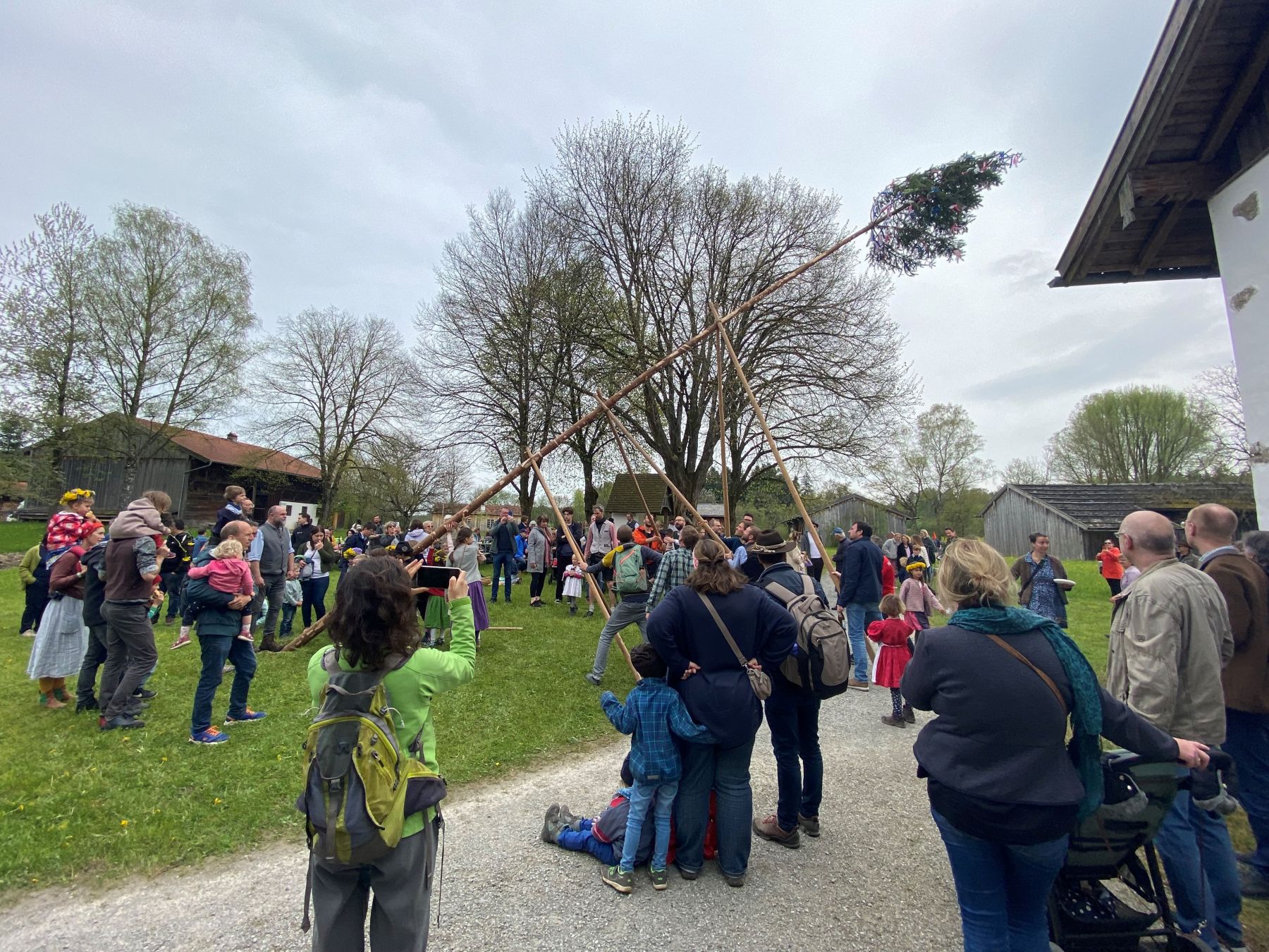 Mit vereinten Kräften wird der Maibaum aufgestellt
