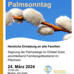Um 10 Uhr wird im Priener Ortsteil Am Gries eine feierliche Palmweihe gefeiert, anschließend ist gemeinsame Prozession mit dem Liturgischen Dienst zum Pfarrheim. Dort wird dann ein Familiengottesdienst gefeiert. Zeitgleich ab 10 Uhr findet noch ein Palmsonntags-Gottesdienst in der Pfarrkirche selbst statt.
