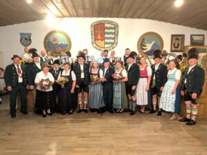 Die drei noch lebenden Initiatoren des Trachtenheims sowie Frieda Würtz wurden im Rahmen der Feierlichkeiten geehrt. Im Bild von links nach rechts: Die stellvertretenden Vorstände Florian Wörndl und Michael Pfaffinger, Frieda Würtz, Andi Bauer mit seiner Frau Marianne, Michael Berneder mit seiner Frau Bärbel, Toni Bauer mit seiner Frau Katharina, Kassier Anton Schuster, Schriftführerin Andrea Scheck, Gauvorstand Thomas Hiendl, stellvertretende Gauvorständin Elisabeth Tengler sowie Vorstand Christoph Kaufmann.