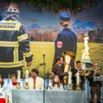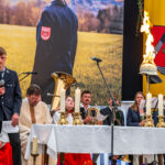 Im Mittelpunkt des Festgottesdienstes stand ein starkes Symbol: Ein brennender Feuerwehrhelm auf der Bühne, angelehnt an das offizielle Logo des Feuerwehrfestes, wurde zum Sinnbild des Tages – und für das, wofür die Feuerwehr steht. Gemeindereferent Tobias Gaiser, der den Gottesdienst leitete, stellte in seiner Predigt die Symbolik des Helms in den Mittelpunkt.