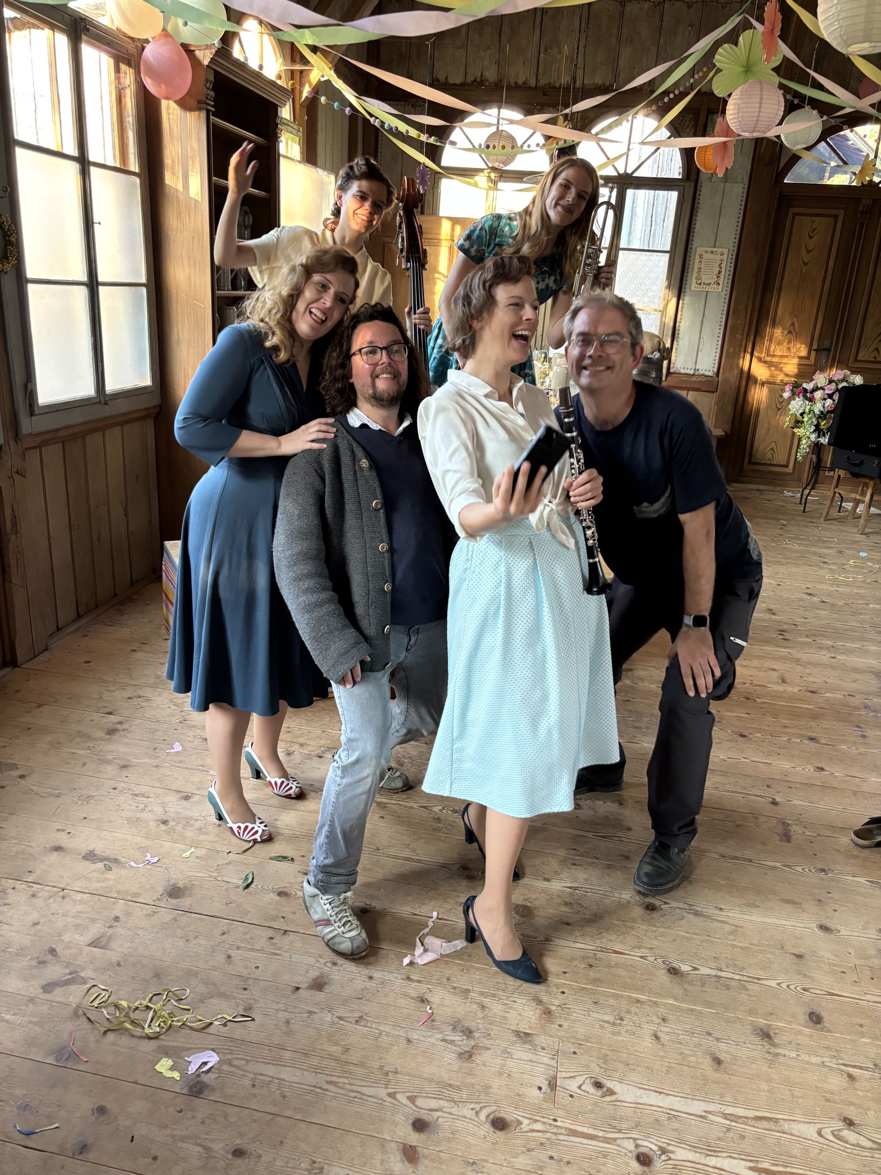 Viel Spaß beim Dreh im Freilichtmuseum Finsterau hatte die „Musikgruppe 1957“ mit v.li. Franziska Wanninger, Anna Wachter, dem Komponisten Florian Burgmayr, Birgit Tomys, Hanna Speinle sowie Drehbuchautor und Regisseur Christian Lex.