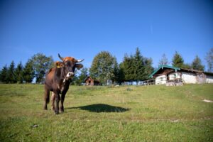 Murnau-Werdenfelser Rinder weiden in den Sommermonaten im Glentleitner Almgelände. Sie waren einst in unserer Region weit verbreitet, sind heute aber im Bestand stark gefährdet. Bildquelle: Bezirk Oberbayern, FLM Glentleiten, Foto: Ralf Gerard.