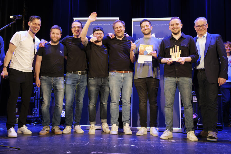 DiaTon – Förderpreis für Dialekt und Musik 2025: Bezirkstagspräsident Thomas Schwarzenberger (rechts) verleiht den ersten Preis an die Bad Aiblinger Band Strawanza. Der Popularmusikbeauftragte des Bezirks Oberbayern, Christoph Schmid (links), war für die Organisation des neu geschaffenen Preises verantwortlich. Foto: Wolfgang Englmaier