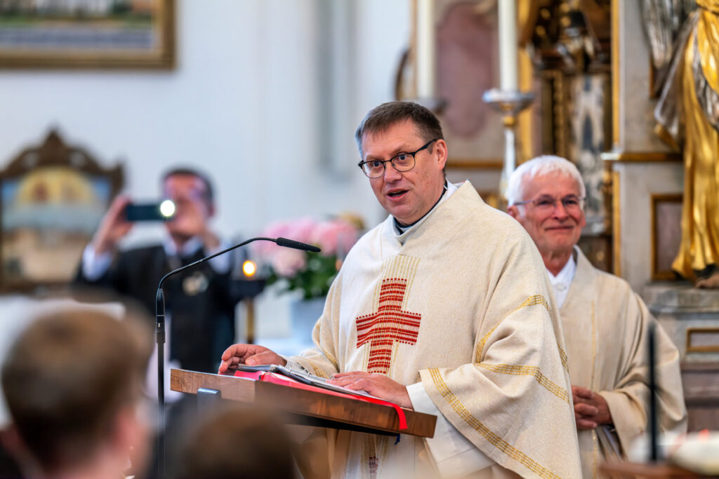 Schon in seiner Begrüßung machte Dr. Florian Herrmann deutlich, dass die Frühjahrswallfahrt für den Katholischen Männerverein weit mehr ist als ein fester Termin im Jahreslauf. Er hieß die Mitglieder des Vereins ebenso willkommen wie die vielen Freunde, Gäste und Teilnehmer, die nach Tuntenhausen gekommen waren. Besonders begrüßte er Ministerpräsident Dr. Markus Söder, dessen Kommen er als große Ehre für den Verein bezeichnete. Herrmann dankte zudem Abt Petrus Höhensteiger OSB für den festlichen Gottesdienst und die eindrucksvolle Predigt sowie allen, die zur musikalischen Gestaltung beigetragen hatten. Die Kirchenmusik und das anschließende Standkonzert gaben dem Tag einen festlichen Rahmen, der die Verwurzelung der Wallfahrt in Kirche, Vereinstradition und regionalem Leben sichtbar machte.