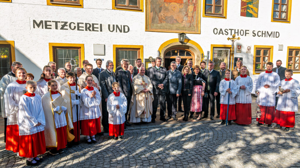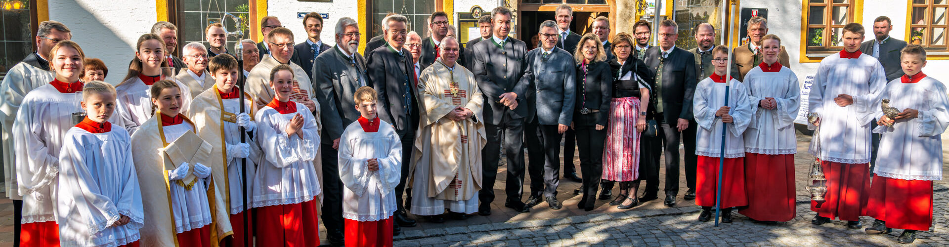 Die Frühjahrswallfahrt des Katholischen Männervereins Tuntenhausen führte zahlreiche Ehrengäste zusammen. Vor dem Festgottesdienst stellten sich Geistlichkeit, Ministranten, Vereinsvertreter und politische Gäste mit Ministerpräsident Dr. Markus Söder zum Gruppenbild vor dem Gasthof Schmid.
