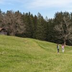 Schon bald erreichen wir die Untere Lindlalm. Auch hier ist es ruhig – nur ein einzelner Mountainbiker überholt uns. Wir beschließen, noch bis zur Oberen Lindlalm und zum nahegelegenen Aussichtspunkt beim höchsten Punkt unserer Tour auf etwa 1000 Metern Höhe zu gehen. Hier begegnen wir erstmals anderen Wanderern.