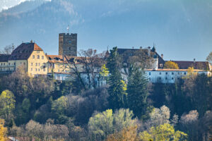 Ein näherer Blick auf Schloss Neubeuern, das weithin sichtbar auf seinem markanten Hügel über dem Tal thront.