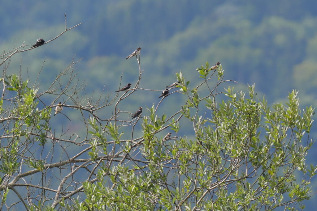 Wenn wenig los ist, lohnt es sich auch immer mal wieder bei “bekannten” Vögeln genauer hinzusehen. So konnte ich schon bald eine juvenile Uferschwalbe mitten unter den zahlreichen Rauchschwalben entdecken. Kurz darauf flog ein Brachvogel ein, welcher ein wenig anders wirkte.