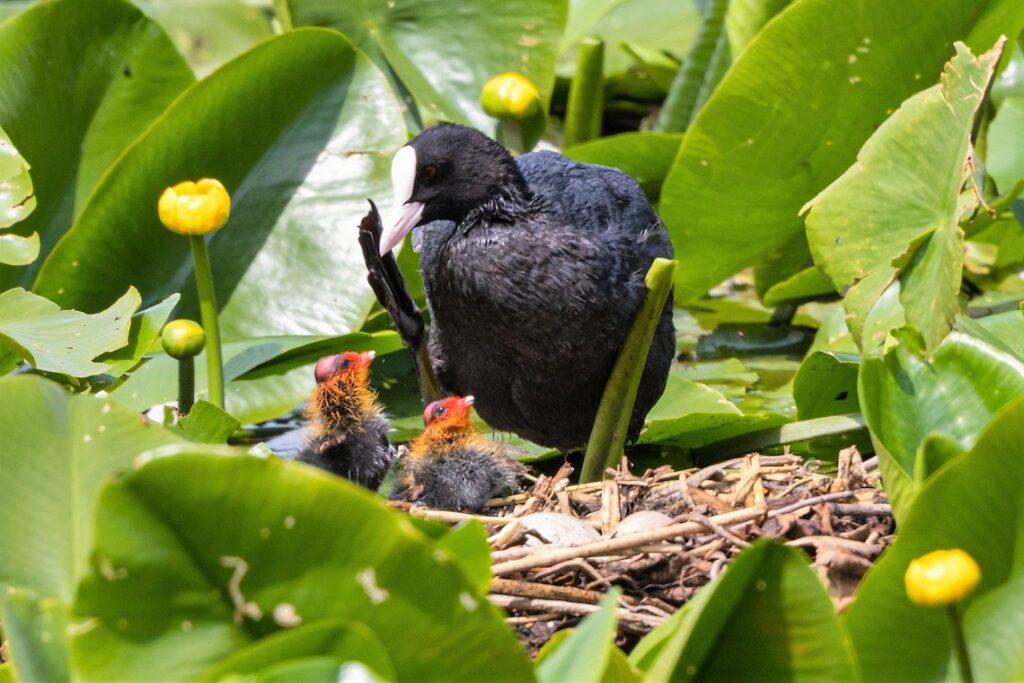 Im Buschwerk hört man zahlreiche Singvögel, z. B. verschiedene Meisenarten oder die Mönchsgrasmücke, über dem Wasser flitzen Mehl- und Rauchschwalben auf der Futtersuche, im Schilf turnen Rohrammer und Rohrsänger, im Schwimmblattbereich sitzt der Wasserfrosch, nisten Haubentaucher und Blässrallen und der Zwergtaucher lässt sein Getriller hören, im Wasser gründeln bzw. tauchen Stock-, Reiher-, Tafel- und Schnatterenten, am westlichen Ufer stehen Grau- und Silberreiher, Lachmöwen und Graugänse versammeln sich auf der Sandbank und der Kormoran trocknet seine Flügel.