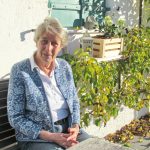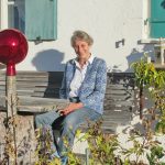 Fotos: Hötzelsperger – Gisa Obermaier´s gehäkelte Ukraine-Herzerl und Gisa Obermaier auf der Feierabend-Hausbank.