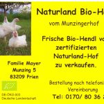Jetzt gibt es sie wieder, die Naturland Bio-Hendl vom Munzingerhof bei Atzing in der Gemeinde Prien. Dort können bei der Familie Mayer frische Bio-Hendl vom zertifizierten Naturland-Hof unter der Telefon-Nummer 0170-8036213 bestellt werden. Die Familie Mayer legt großen Wert auf hochwertiges und tiergerechtes Bio-Futter, auf saubere und artgerechte Tierhaltung und darauf, dass keine Medikamente eingesetzt werden – ganz im Sinne des Einklangs von Mensch und Natur.
